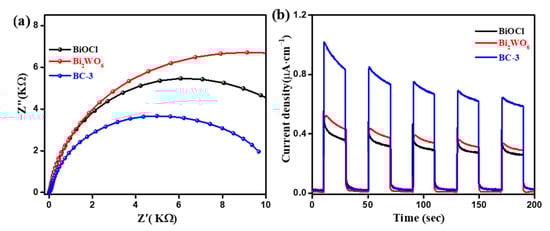 The separation efficiency and kinetic barrier of Bi2WO6/BiOCl were revealed by EIS and photocurrent response. Sensitive and reproducible photocurrent responses of the sample under on/off visible light irradiation can be observed from Figure 12a. The BC-3 nanocomposite had higher photocurrent responses than pure BiOCl and Bi2WO6, illustrating an efficient charge transmission [30,42]. Furthermore, Figure 12b shows that the arc radius of the BC-3 nanocomposite was smaller than pure BiOCl and Bi2WO6, which suggests a lower charge transfer resistance [16,31]. Thus, the heterojunction interface between BiOCl and Bi2WO6 could provide a driving force for charge separation and transfer.