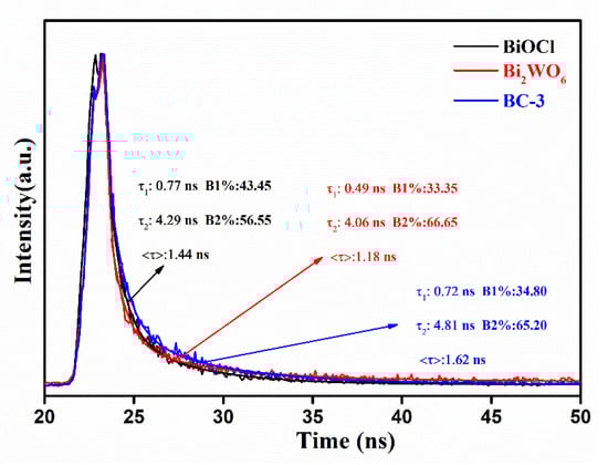 The TRPL spectra was used to further identify the charge transfer dynamics. As depicted in Figure 13, the curves are fitted well based on a two exponential decay function [25,31,46]. The average PL lifetimes of pure BiOCl, Bi2WO6, and BC-3 nanocomposite were calculated to be 1.44, 1.18, and 1.62 ns, respectively. Obviously, the average lifetimes of BC-3 nanocomposites are longer than those of pure BiOCl and Bi2WO6, which further indicates the most efficient migration of photoexcited charges [25,31]. As a result, a notable synergetic effect between BiOCl and Bi2WO6 can optimize the electronic structure and suppress the recombination of charge carriers, thus promoting the catalytic performance.