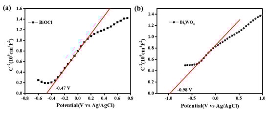 The Mott–Schottky plots of the samples are shown in Figure 14. The flat-band potential (Efb) could be determined based on the Mott–Schottky curves [16,47]. The positive slope of the curves suggests that the BiOCl and Bi2WO6 are n-type semiconductor. Notably, the Efb values of BiOCl and Bi2WO6 were determined to be −0.47 and −0.98 V (vs. Ag/AgCl), respectively. Therefore, the CB potential values of the BiOCl and Bi2WO6 were −0.25 and −0.76 V (vs. NHE, pH = 7), respectively [23,31]. Based on these results, the valence band (VB) positions were determined to be 3.06 and 1.90 V. These results indicate that the construction of a heterostructure interface between the BiOCl and Bi2WO6 can significantly improve photoinduced carrier separation efficiency and photocatalytic efficiency due to the matching energy levels.