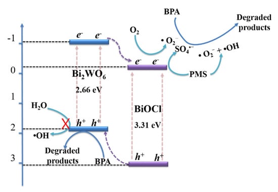 Based on the above analysis, the possible mechanism for BPA degradation is portrayed in Figure 15. The heterojunction structure is obtained at the interface between BiOCl and Bi2WO6. Under light irradiation, Bi2WO6 is excited to form electrons and h+ [38,43]. The photogenerated electrons flow to the heterojunction interface, then to the CB of the BiOCl. The accumulation of electrons at the CB of the BiOCl reduce O2 and PMS in the solution to generate •O2− and SO4•− radicals [5,48]. Meanwhile, the generated h+ in the VB of BiOCl can easily accumulate at the surface of Bi2WO6 to directly degrade organic pollutants [40]. The •OH cannot be produced by h+ in the VB of Bi2WO6 due to its low oxidizing capacity, whereas a small amount of •OH is formed by the contribution of •O2− or PMS [26,42]. This result agrees well with the reactive species trapping experiments.