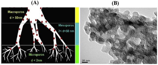 (A) Schematic diagram representing the three types of pores for pollutant adsorption [16]. Reprinted with permission from the Journal of Analytical and Applied Pyrolysis, Copyright Elsevier 2021. (B) TEM image of AC showing the hierarchical pore distribution [17]. Reprinted with permission from Applied Surface Science, Copyright Elsevier 2019.