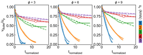 The final residual bullet velocity vfinal and penetration time for different at different up are presented in Figure 6. Firstly, the penetration performance of different materials can be compared by a commonly used parameter, that is, ballistic limit velocity, which is defined as the lowest velocity required to penetrate the target completely. Here, the ballistic limit velocity can be roughly treated as 3 km/s for all the draw ratio, as shown in Figure 6. We found that vfinal maintains linear increase relation with up for the bullet with different (up ≥ 3 km/s). Besides, obvious increase of residual velocity exhibits increasing from 3 to 6, while this trend becomes unclear with further increasing from 6 to 9, appearing to imply a limited value for draw ratio in the penetration process. That means complete penetration and subsequent inertia-driven motion. In this case, we further present the function of penetration time and incident velocity in Figure 6b. Obviously, penetration time decreases with increasing up, especially for the case of high draw ratio. Noting that the thinnest bullet () experiences the longest penetration time related to the apparent geometric dimension.