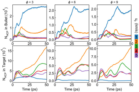 To roundly understand the elastic-plastic deformation mechanism in impacted material, the number of HCP (stacking faults) atoms Nhcp in both the bullet and target for different at different up are summarized in Figure 8. For the bullet part, the stacking fault and slip dominate the plastic deformation behavior at the case of low incident velocity (1 km/s), and the HCP atoms number, thus, increases rapidly from the beginning of the impact process, while obviously decreases when the up increases to 2 km/s. It is found that the HCP atoms number in the bullet shows minor discrepancy as the up higher than 3 km/s, indicating the main deformation mechanism has transformed to amorphization and melting at such high incident kinetic. With regard to the target, the number of HCP atoms at the case of 2 km/s is larger than other incident velocity, which can be attributed to strong nanoscale surface effect. Specifically, the incident kinetic is not high enough to penetrate the target completely and hence mainly acted as a deformation energy source, resulting in remarkable overall deformation in the target. For the cases of up ≥ 3 km/s, a similar variation trend is found in the target. The draw ratio of the bullet also plays an important role in the history of HCP atoms number. The maximum of HCP atoms number decreases with the increasing in both the target and bullet at the case of up ≤ 2, while it exhibits similar variation range at the higher incident velocity.