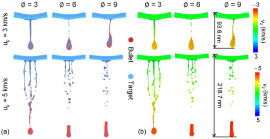Figure 5 compares the characteristics of penetration with different at up = 3 and 5 km/s. The impact front of the bullet forms similar spike under relatively low velocity (3 km/s). For the case of , over half of the bullet mixes with the target and causes large damage area compared with the case of , which possesses smaller contact region, as shown in Figure 5a. Noting that the radius of crater is close to the radius of the bullet at the moment. However, due to the strong release effect at the bottom surface of the target after strong loading, the damage mode is not limited to localized amorphization, but transformed to uniform spherically fragmentation at the high-speed impact (5 km/s), as shown in Figure 5b. Obviously, higher incident kinetic can form larger damage area and produce more fragmentations.