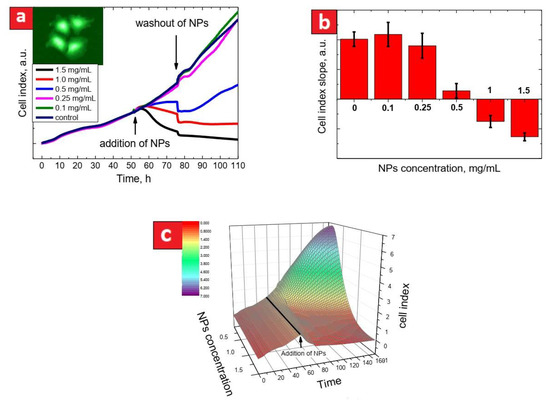 (a): evolution of cell index curves for HepG2 cells. Arrows show the times of addition and washing out (with a change of cell medium) of the CFO NPs. The inset shows photoluminescent image of the HepG2 cells exposed to 0.5 mg/mL of the NPs for 4 h; (b): the NPs toxicity for the HepG2 cells expressed in terms of cell index slopes measured in presence of CFO NPs during 50–70 h (each data column is an average of 8 curves ± SD); (c): toxicity surface plot (the case of HePG2 cells) represented in “time/NPs concentration/cell index” coordinates (the black line indicates the time of CFO NPs addition).
