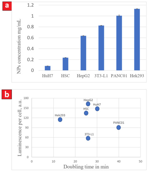In order to check the hypothesis assuming the enhanced CFO-induced cell toxicity for the cell lines with higher proliferation rate, we plotted in Figure 2b luminescence intensity of the cells uptaking the luminescent CFO NPs with concentrations stopping cell proliferation as a function of doubling time (the time required to double the value of the cell index and thus the cell number). Indeed, as has already been demonstrated earlier, the uptake of the NPs by cells strongly depends on their proliferation rate [30]. The results show the absence of any correlation between the cell sensitivity to the CFO NPS and cell proliferation rate (Figure 2b).