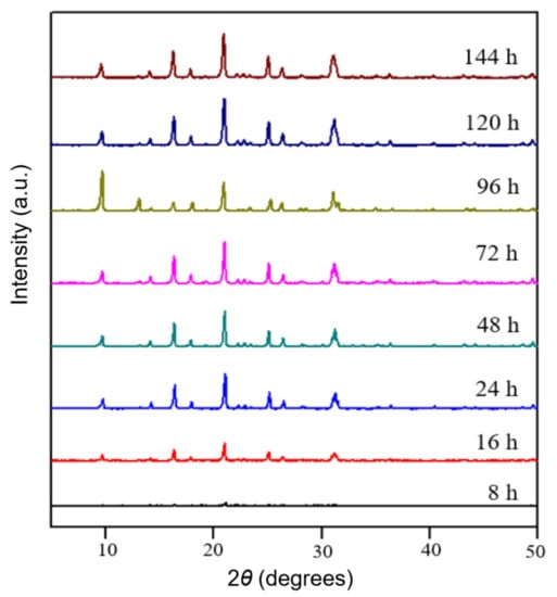 The unconventional synthesis process was conducted as follows: Al(NO3)3 (Damao, Tianjin, China) was dissolved in deionized water with stirring at 25 °C. Then N,N,N-trimethyl-1-adamantanammonium hydroxide (TMAdaOH, 25 wt.%, Alladin, Shanghai, China) was added in the solution as SDA and stirred for 30 min. NaOH (Kemiou, Tianjin, China) was mixed in the solution. The colloidal silica (40 wt.%, Aldrich, Burlington, MA, USA) was added in slowly after NaOH was dissolved completely. Then the solution was transferred to a Teflon reaction kettle for reaction at 433 K for a certain time, and the synthesis conditions were listed in Table 1. Sample S-15 for comparison was synthesized with the conventional process. When the SDA and NaOH were mixed uniformly, the Al source was added to the solution. The difference in feeding sequence between conventional and unconventional processes is shown in Scheme S1.