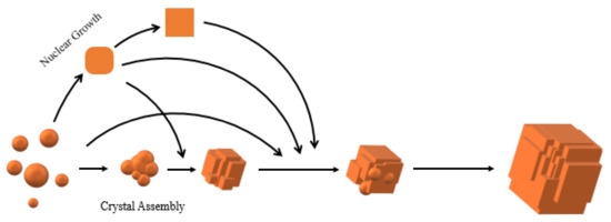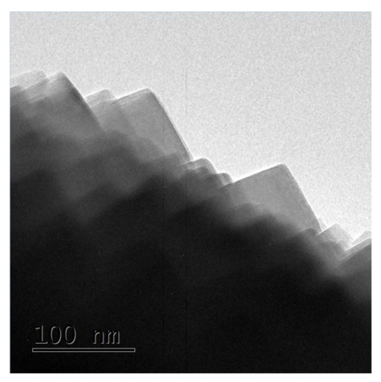 The above phenomena indicated that the zeolite grew from spherical crystal to rounded crystal and then to cubic crystal during the assembly of the unit crystal. Regardless of the shape of the unit crystal, it participated in the assembly process. The specific crystal growth diagram is shown in Figure 5. With the extension of reaction time, it can be seen from the TEM images of sample S-6 in Figure 6 that there was no obvious pore structure inside the crystal, and there were many staggered crystals on the sample surface. Some cracks appeared in the interlaced part of the sample surface.