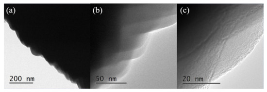 Table 3 shows the adsorption data of each sample. It can be seen that, with the introduction of fluorine into the synthesis system, the laminated assembly phenomenon of the samples is more obvious while the specific surface area decreases. This may be due to the gradual increase in crystal size. Among them, sample S-12 has the largest mesoporous volume and desorption cumulative pore internal surface area, which are 0.06 cm3/g and 56.74 m2/g, respectively. Combined with the TEM picture of sample S-12 (Figure 11b), it can be seen that there is no obvious mesoporous structure inside the crystal (Figure 11a). However, there are indeed some nanoscale pores near the surface of the sample crystal (as shown in Figure 11c), which is consistent with the results of the N2 adsorption isotherm and pore size distribution of the sample. The above results indicated that the optimal ratio of F/Si was 0.05.