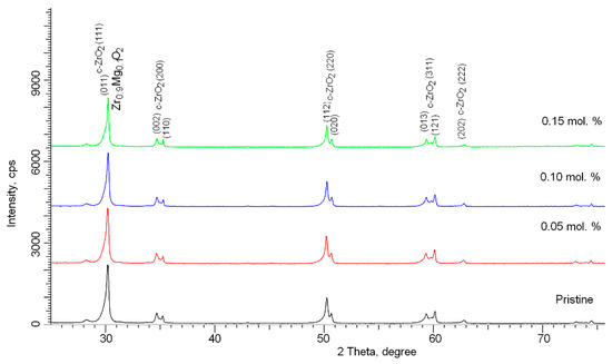 The concentrations of the MgO dopant were 0.05, 0.10 and 0.15 mol.%; these values were chosen with a view to studying the effect of additives on changes in structural and strength properties. Micron-sized ZrO2 and MgO powders manufactured by Sigma Aldrich (Sigma Ltd., Saint Louis, MO, USA) were used as starting reagents; the chemical purity was 99.95%.