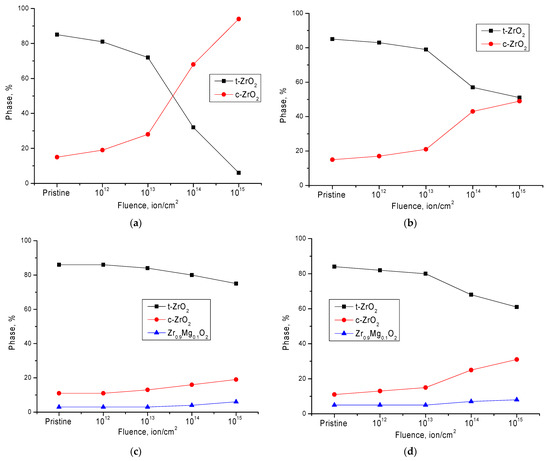 Figure 3 below shows the results of changes in the phase composition of the studied ceramics depending on the irradiation fluence, as well as the concentration of the dopant in the structure. In the case of initial, undoped ceramics, the dynamics of changes in the phase composition as a result of polymorphic transformations t-ZrO