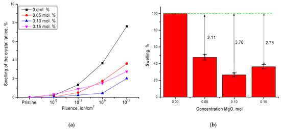 Figure 4. As seen in the data presented, the greatest swelling of the crystal structure is observed in the case of undoped ceramics and at the maximum irradiation fluence is more than 7.5%. This behavior of the crystal lattice is primarily due to structural distortions resulting from polymorphic transformations, as well as the accumulation of radiation damage as a result of irradiation. Doping of ceramics leads to a more than twofold decrease in the degree of swelling at a dopant concentration of 0.05 mol.%, decreasing by a further 2.7–3.7% when the impurity phase Zr