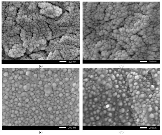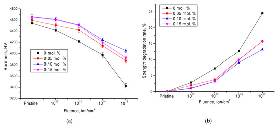 Figure 5 shows the results of changing the strength characteristics—in particular, the hardness and degradation degree—depending on irradiation fluence. According to the data obtained, doping leads to an increase in hardness of the initial samples by 1.1–2.4%, depending on the MgO concentration. This increase is due to a change in the structural parameters and an increase in the density of ceramics.
