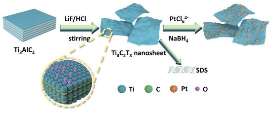 Schematic illustration of SDS modified-Ti3C2Tx/-Pt nanocomposites.