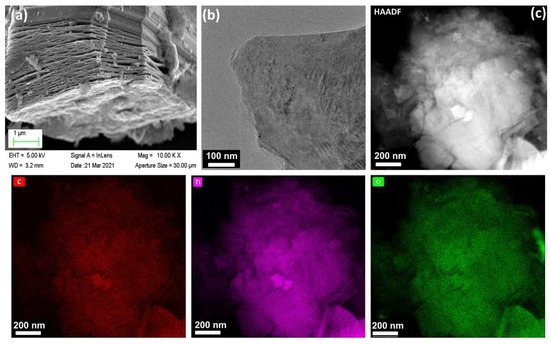 (a) SEM, (b) TEM and (c) HAADF-STEM images of Ti3C2Tx product from etching Ti3AlC2 precursor. EDX mappings of C, Ti and O.