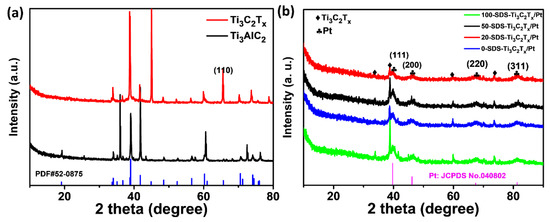 XRD patterns of (a) initial and etching Ti3AlC2, (b) XRD patterns of 0-SDS-Ti3C2Tx/Pt, 20-SDS-Ti3C2Tx/Pt, 50-SDS-Ti3C2Tx/Pt, 100-SDS-Ti3C2Tx/Pt nanocomposites.