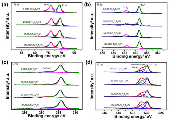 High-resolution XPS spectrum of Pt 4f (a), Ti 2p (b), C 1s (c) and O 1s (d) for 0-SDS-Ti3C2Tx/Pt, 20-SDS-Ti3C2Tx/Pt, 50-SDS-Ti3C2Tx/Pt and 100-SDS-Ti3C2Tx/Pt nanocomposites.