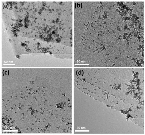 TEM images of (a) 0-SDS -Ti3C2Tx/Pt, (b) 20-SDS-Ti3C2Tx/Pt, (c) 50-SDS-Ti3C2Tx/Pt, (d) 100-SDS-Ti3C2Tx/Pt catalysts.
