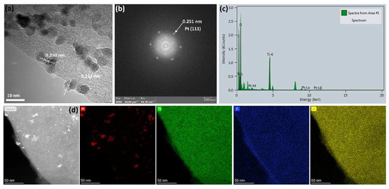(a) HRTEM, (b) SAED pattern and (c) EDX element analysis and (d) mappings of 100-SDS-Ti3C2Tx/Pt nanocomposite.