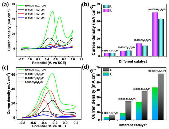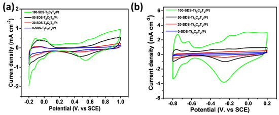 In order to study the electrocatalytic activity of the catalyst, cyclic voltammetry (CV) curves were used to investigate the electrocatalytic activity of different catalysts in the acidic ethanol and the alkaline ethanol. The CV curves of 0-SDS-Ti3C2Tx/Pt, 20-SDS-Ti3C2Tx/Pt, 50-SDS-Ti3C2Tx/Pt and 100-SDS-Ti3C2Tx/Pt catalysts in 0.5 mol L−1 H2SO4 solution were measured. As shown in Figure 7a, the cathode and anode peaks with the potential range of −0.2 V to 0.1 V correspond to the absorption peak and desorption peak of monolayer hydrogen under acidic conditions, respectively. The electrochemically active area (ECSA) of the electrode can be estimated from the peak area of the hydrogen absorption and desorption [32,33]. ECSA = Qh/(0.21 × m), where Qh represents the amount of electricity during hydrogen desorption, and m is the content of Pt on the electrode. According to this formula, the ECSA of 100-SDS-Ti3C2Tx/Pt, 50-SDS-Ti3C2Tx/Pt, 20-SDS-Ti3C2Tx/Pt, 0-SDS-Ti3C2Tx/Pt nanocomposite catalyst is 9.02, 5.67, 2.60, 1.80 m2 g−1, respectively. The larger ECSA is, the higher catalytic activity is achieved in the acidic media. Figure 7b shows the CV curve of 0-SDS-Ti3C2Tx/Pt, 20-SDS-Ti3C2Tx/Pt, 50-SDS-Ti3C2Tx/Pt, and 100-SDS-Ti3C2Tx/Pt nanocomposites in 1 mol L−1 KOH solution. The sweep potential range is −1.0 V~0.2 V. As shown in this figure, during the reverse scanning process, all catalysts have obvious redox peaks at −0.25 V. Among these catalysts, the 100-SDS-Ti3C2Tx /Pt catalyst has the largest peak current density, indicating the highest electrocatalytic activity. As mentioned above, the ECSA value of 100-SDS-Ti3C2Tx/Pt is obvious higher that of 50-SDS-Ti3C2Tx/Pt, 20-SDS-Ti3C2Tx/Pt and 0-SDS-Ti3C2Tx/Pt electrode, rendering the highest electrochemical activity among these catalysts. This is attributed to the better dispersion of catalyst nanoparticles on the surface of Ti3C2Tx with more SDS surfactant, which increases the more active sites for electrochemical reactions.