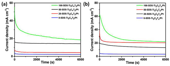 In order to compare the stability of the 0-SDS-Ti3C2Tx/Pt, 20-SDS-Ti3C2Tx/Pt, 50-SDS-Ti3C2Tx/Pt and 100-SDS Ti3C2Tx/Pt catalysts in the electrocatalytic process, the chronoamperometry was employed to analyze the performance of catalysts in the mixed solutions of 0.5 mol L−1 H2SO4+1 mol L−1 C2H5OH and 1 mol L−1 KOH+ 1 mol L−1 C2H5OH. Generally, the attenuation of the oxidation current density means the decrease of catalyst activity and the catalyst poisoning, which results from the adsorption of the CO intermediate product from the oxidation of ethanol on the surface of Pt [37,38]. As shown in Figure 9a, the current density of all catalysts decreases significantly in the beginning and then gradually stabilized. The results show that the 100-SDS-Ti3C2Tx/Pt nanocomposite still has the highest current density after 6000 s chronoamperometry test, indicating its better anti-poisoning ability and stability. Besides, in 1 mol L−1 KOH+1 mol L−1 C2H5OH solution, the final steady-state current density of the 100-SDS-Ti3C2Tx/Pt catalyst is also highest than others (Figure 9b). These results confirm that 100-SDS-Ti3C2Tx/Pt has the best anti-poisoning ability and stability during the electrocatalytic oxidation of ethanol, no matter in the acid or the alkaline media, which is consistent with the previous CV results. Moreover, we measured the repeatability of electrocatalytic activity for the 100-SDS-Ti3C2Tx/Pt catalyst, and the results were shown in Figure S5. After the catalyst has been put aside for one month, the current density of 100-SDS-Ti3C2Tx/Pt still kept 92.8% and 87.2% of its initial current density for acid (Figure S5a) and alkaline solution (Figure S5b). Although the higher catalytic activity of alkaline solution that acid solution, the100-SDS-Ti3C2Tx/Pt catalyst displayed a better repeatability in acid solution.