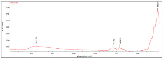 The presence of the organic layer coating the magnetic nanoparticles Fe3O4-PABA is proved both by the elemental composition (Fe, O, C and N) provided by Energy dispersive X-ray spectroscopy (EDX) (Figure S2 in the Supplementary Materials) and by the characteristic absorption bands in the FT-IR spectrum (Figure 3). The most representative bands are the stretching of the free –NH3+ group at 3412 cm−1, asymmetric stretching vibrations of carboxylate groups at 1591 cm−1, and the O-H bending band from the carboxylic group at 1439 cm−1. The characteristic band assigned to the Fe-O stretching can be observed at 540 cm−1.