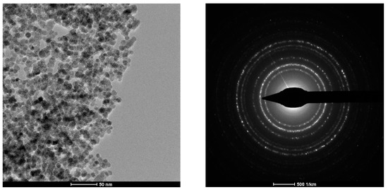 The morphology of the MW-NPS-1 nanoparticles was determined by TEM (Figure 5). The presence of the silica shell, with a thickness of approximately 2 nm, was proved by analyzing the obtained micrographs. The SAED image confirms the crystal structure of Fe3O4.