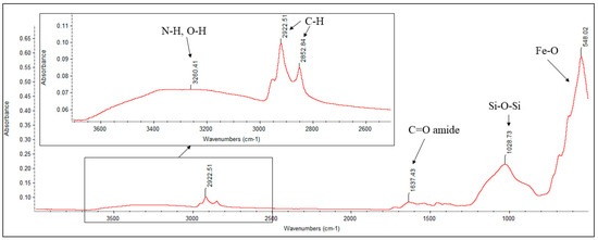 Obtaining of the MW-NPS-1-APS-HMBA and MW-NPS-2-APS-HMBA nanostructured systems was confirmed by FT-IR spectra (Figure 7 and Figure 8) by the presence of characteristic bands of the N-H and O-H stretching vibrations at 3260 cm−1 and 3382 cm−1, respectively, and the band corresponding to the C-H stretching vibration at 2922 and 2852 cm−1, and 2929 cm−1, respectively. Additionally, the band corresponding to the C=O stretching vibration of the secondary amide at 1637 cm−1 and 1644 cm−1, respectively, and the characteristic bands of the asymmetric stretching vibration of Si-O-Si at 1028 cm−1 and 1032 cm−1, respectively, can be found. The characteristic band of magnetite corresponding to the Fe-O bond can be observed at 548 cm−1 and 554 cm−1, respectively, for the two materials.