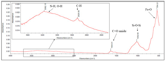 The functionalization with APTMS of MW-NPS-1 and MW-NPS-2 nanoparticles was confirmed by the FT-IR spectra (Figures S17 and S18 in the Supplementary Materials) by the presence of absorption bands characteristic of the free -NH2 groups at 3361 and 3202 cm−1, and 3429 and 3229 cm−1, respectively, and of the band corresponding to the stretching vibration CH at 2931 cm−1 and 2929 cm−1, respectively. Additionally, the characteristic bands of asymmetric stretching vibrations of Si-O-Si at 1032 cm−1 and 1040 cm−1, respectively, can be observed, and the characteristic band of magnetite can be observed at 549 cm−1 and 541 cm−1, respectively, corresponding to the Fe-O.