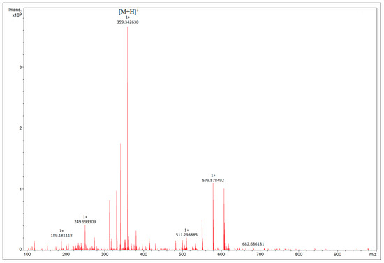 The isotopic peaks of type ([M+H]+ + 1), ([M+H]+ + 2), ([M+H]+ + 3) from the protonated molecular ion [M+H]+ were also identified by the first screening before the MS-MS experiment (Figure S21 in the Supplementary Materials).