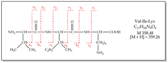 The structure was also confirmed by examining the characteristic fragmentation of the tripeptide according to the general scheme presented in Figure 10. The theoretical and identified experimental fragments are presented in Table 4 and Table 5.
