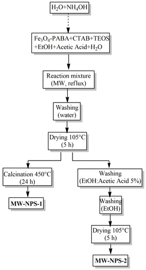 A modified sol–gel method was used for the synthesis of the MW-NPS nanoparticles in microwave field. In the adopted procedure, TEOS was used as a source of silica for the formation of the secondary shell, NH4OH as catalyst, and CTAB as surfactant, the reaction mixture being heated to reflux by microwave irradiation. The disadvantage of using CTAB as a template is related to the removal process by calcination or washing. The advantage of calcination is the complete template elimination; however, the processing operations involve a long time, high costs, and a specific surface area mitigation at higher temperatures. By washing, the template is partially removed, yielding an intact silica shell and low nanoparticle aggregation.