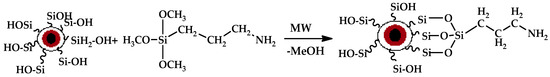 With respect to surface functionalization, MW-NPS was treated with (3-aminopropyl) trimethoxysilane (APTMS). Briefly, 120 mg MW-NPS, 30 mL CH2Cl2 and 5 mL APTMS were heated using microwave irradiation (MW) for 30 min, washed several times with ultra-pure water, and dried at 105 °C.