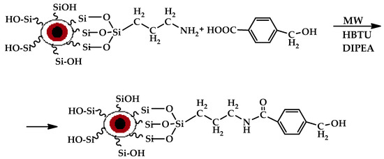 The Fe3O4–PABA was prepared using the co-precipitation method. The second step in the synthetic route was based on the microwave-assisted reaction to obtain the Fe3O4–PABA-SiO2 (MW-NPS, Scheme 1) nanoparticles with relatively uniform particle size, using a modified microwave-assisted sol–gel homogeneous precipitation method with NH4OH as the alkaline agent, CTAB as the surfactant, and TEOS as the silica source. Microwave-assisted synthesis ensures an efficient diffusional reagent transfer, as well as an efficient silica precursor polycondensation reaction. Both the third and the final synthetic step were also accomplished by microwave heating, respectively with (3-aminopropyl) trimethoxysilane and 4-(hydroxymethyl) benzoic acid, ensuring a higher diffusion rate in the material and an easier transfer of reactants at the reaction center (Scheme 2 and Scheme 3).