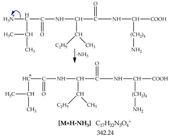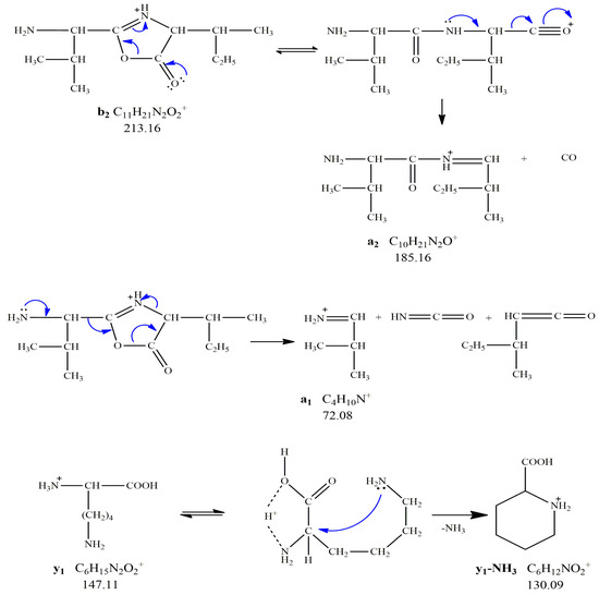 For the identified fragments type [M+H-NH3]+, b1, b2, y1, a1, a2, y1-NH3, y2-NH3 possible formation mechanisms are proposed in Scheme 4, Scheme 5, Scheme 6 and Scheme 7, adapted from the literature [23,24]: