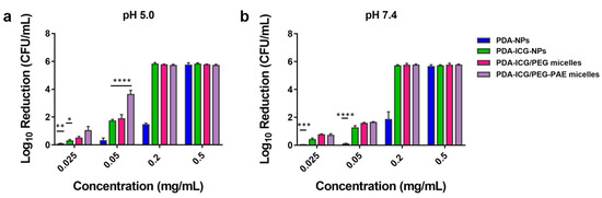Photothermal killing of staphylococci in suspension by PDA-ICG-NPs and encapsulated PDA-ICG-NPs upon NIR irradiation were significantly higher (p < 0.05, two-way ANOVA) than killing by PDA-NPs at concentrations below 0.5 mg/mL. Photothermal killing by PDA-NPs was less than 2 log-units and significantly smaller than by PDA-ICG-NPs up to a concentration of 0.2 mg/mL (Figure 2). At pH 7.4, there were no differences between encapsulation in PEG-PAE or PEG micelles at the highest concentration of 0.5 mg/mL applied (Figure 2b). At pH 5.0, however, staphylococcal killing by PDA-ICG/PEG-PAE micelles was significantly higher (p < 0.05, one-way ANOVA) already at low concentrations (<0.2 mg/mL; Figure 2a) than by PDA-ICG-NPs encapsulated in PEG micelles.