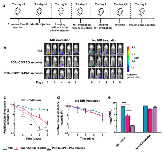 Two days after initiating infection, i.e., at day 0, mice were randomly divided into three groups of twelve mice and anesthetized by intraperitoneal injection of an aqueous solution of 4 wt% chloral hydrate (8.25 mL/kg body weight). Next, 200 μL of PDA-ICG/PEG-PAE micelles or PDA-ICG/PEG micelles in PBS (1 mg/mL) were administered by tail-vein injection. As a control, mice were injected with 200 μL PBS. At day 1 after initiating infection, the initial bioluminescent intensity arising from the wound site was recorded using a bio-optical imaging system (Lumina III, Imaging System, Perkin Elmer, Waltham, MA, USA, exposure time of 30 s, medium binning 1 f/stop, open emission filter). Subsequently, each group of mice was split in two groups. One group received irradiation at the infection site with an 808 nm NIR laser (10 min, 1300 mW/cm2), while the other group was left without irradiation. 24 h after administration of the first injection, encapsulated photothermal nanoparticles were administered again and administration was repeated for three consecutive days. Bioluminescent images were recorded every other day, preceded by NIR irradiation (depending on the group considered). On day 8, all mice were sacrificed. For CFU enumeration, tissue samples from the infection sites were excised, weighted and put into a tube with 1 mL of PBS. After homogenization (Diunce Tissue Grinder), 2 mL of PBS was added to each sample and vortexed for 1 min. Next, samples were serially diluted and plated on TSB-agar with kanamycin for growth of S. aureus Xen36. After culturing at 37 °C for 24 h, numbers of CFUs were enumerated.