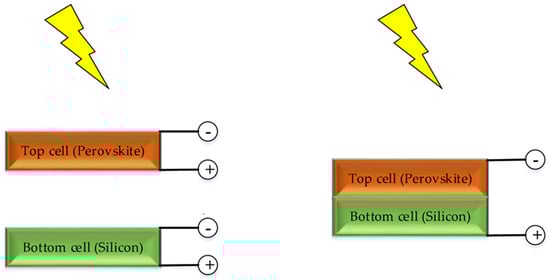 Technologically, three unique tandem cell structures are proposed by the research community; 2T (Two Terminals), 4T (Four Terminals) (Figure 1), and spectrally split tandem-based cell structures. Predominantly, while the spectrally split tandem cell is less cost-effective, this paper does not review spectrally split PSC-Si tandem cells due to the complex and expensive optics incurred in spectrally split PSC-Si even though it achieved high efficiency of beyond 28% [,]. In addition to the high cost incurred by the optical system, another concern is its unsuitability for adopting spectrally-split PSC-Si tandem due to light angular distribution sensitivity []. However, the standard classification is based on the choice of current contact terminals.