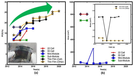 Illustration of the certified various perovskite cell and multi-cells, (a) the efficiency trend, the inset shows real minimodules produced by Toshiba []; (b) the area of the corresponding cells for the same period for higher cells area, and the inset represents the corresponding thin film (various) small area graph. Some data points in Figure 3 coincide with each other. Data are obtained from solar cell efficiency tables (42–57) available at www.onlinelibrary.wiley.com.