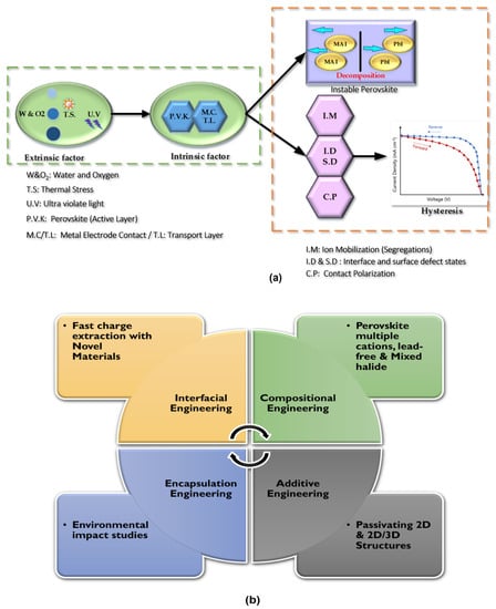 As explained earlier, we may sum up the perovskite instability factors in Figure 4a, which portrays the entire perovskite degradation mechanisms manifested in extrinsic and intrinsic effects. The humidity, thermal stress, and UV light are the main external factors of the perovskite solar cell, which requires extensive perovskite encapsulation engineering research, as depicted in Figure 4b. Although extrinsic effects are considered a triggering means for the perovskite decomposition, the intrinsic instability factors in Table 4, such as active layer low activation energy of decomposition, carriers transport layers, and metal electrode reaction, are likely to be the leading cause for the ion segregation mechanisms, free surface states and hence hysteresis. Therefore, we can understand that intrinsic perovskite instability is the primary area driving mechanism on which the perovskite research shall concentrate. We have observed that most perovskite research may focus on several engineering areas in Figure 4b. However, collective and comprehensive engineering (herein, we refer to as stability engineering) is highly required to address perovskite intrinsic stability. In light of Table 4 various solution methods for the PSC instabilities, we propose the concept of stability engineering as a guiding and formal design tool rather than handling one specific engineering method and neglecting the other design methods.