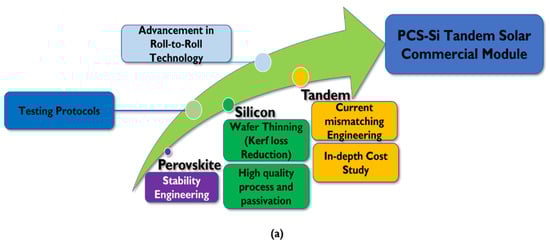 The uncertainty in energy markets caused by the coronavirus disease-19 (COVID-19) pandemic has further highlighted the demand for renewable energy—Especially in the solar cell market—Due to the unreliability of oil as a constant source of income which may hinder the renewable energy resource market [,]. Accordingly, low-cost and highly efficient photovoltaic (PV) materials are immensely required as a source of renewable energy to overcome our dependency on fossil fuels in the context of minimizing global carbon footprint. Ideally, to economically compete with other clean energy resources, the cost of the PV module must be offset by highly efficient power output and operation cycle prolongation []. In theory, the need for tandem solar cells stems from the single-junction solar cell power conversion efficiency (PCE) intrinsic thermodynamics (Shockley-Queisser) limitation (i.e., around 29% in visible light range for the silicon) []. To date, the silicon heterojunction mono-crystalline silicon, inter-digitated back contact (IBC), and silicon heterojunction (SHJ) solar cells have shown sufficiently remarkable results on lab-scaled cell’s PCE > 26%. However, the state-of-the-art silicon solar cell technology is still struggling to offset around 3% from the calculated theoretical thermodynamic limit since 2017, limited by passivation and light losses [,]. Therefore, multi-junction photovoltaic or tandem solar cells (TSCs) represent a paradigm shift towards surpassing intrinsic single-cell limitations by stacking high bandgap solar cells over the bottom silicon solar cell [].