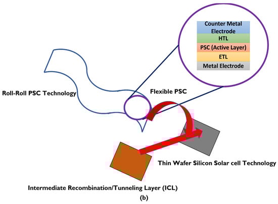 In comparison, perovskite-perovskite solar cell (PSC-PSC) and PSC-Si tandem solar cell have yielded over 24% PCE and 28% PCE, respectively, with the top absorber wide bandgap ~1.7 eV [,,,,]. However, perovskite’s reliability issues and many complex phenomena impede its successful industrialization and wide implementation []. Hence, there is a compelling need for a parallel optimization process of top-cell perovskite while the entire tandem cell is being carefully designed. The upcoming sections of this work will portray the recent challenging issues of PSC-Si tandem and propose state-of-the-art solutions thematically.