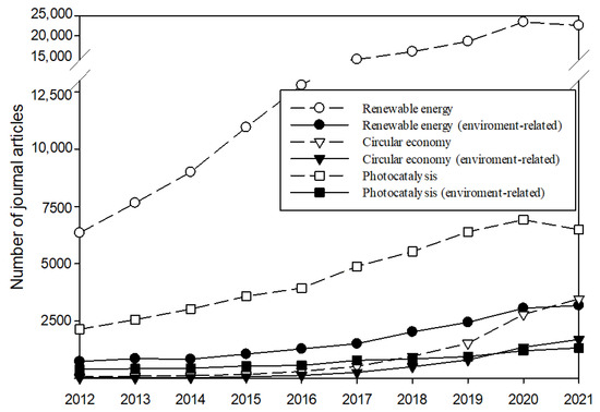 SCI journals focusing on the circular economy, renewable energy, and photocatalysis. Environment-related represents the articles associated with the categories of environmental engineering, environmental science, or environmental studies.