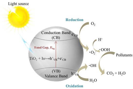 Photocatalysis occurs by utilizing light and semiconductors as the substrate [21], as illustrated in Figure 2. The substrate absorbs light and alters the rate of a chemical reaction. In this phenomenon, when a substrate adsorbs photons with the energy exceeding the bandgap energy, an electron-hole (e−−h+) pair is formed by exciting electrons from the valence band to the conduction band. The existence of the valence band holes (hVB+) and conduction band electrons (eCB−) is typically transient and rapidly removed by recombination with heat or light emission. For certain materials, namely photocatalysts, the lifetime of the e−−h+ pair is extended, allowing a fraction of the e−−h+ pairs to migrate through the substrate to the surface, performing redox reactions in the surrounding medium [22,23]. The hVB+ can oxidize water and hydroxyl anions to generate hydroxyl radicals (OH), while dissolved oxygen can be reduced by the eCB−, leading to the formation of superoxide radical anions (O2−) or hydroperoxyl radicals (OOH) with further protonation [24]. These strong oxidizing radical species allow the degradation or mineralization of pollutants in the environment upon the exposure of a photocatalyst to light.