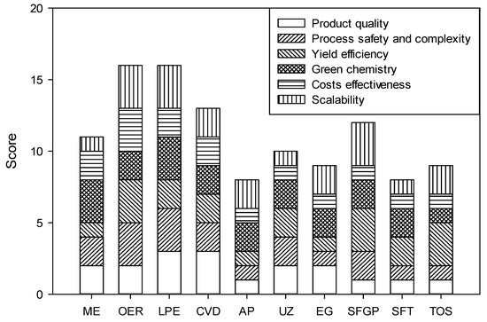 Score evaluation of different methods for graphene synthesis (ME, OER, LPE, CVD, AP, UZ, EG, SFGP, SFT, and TOS represent mechanical exfoliation, oxidative exfoliation-reduction, liquid-phase exfoliation, chemical vapor deposition, arc plasmas, unzipping of carbon nanotubes, epitaxial graphene growth, substrate-free gas-phase synthesis, soft-hard template approach, and total organic synthesis, respectively) (Scoring system: 1-low, 2-medium, and 3-high) [58].