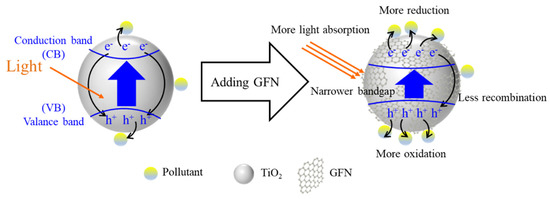 Studies have demonstrated the enhanced photocatalysis activity of GFN-TiO2, as illustrated in Figure 5. An optimal graphene addition content (e.g., 0.05 wt%) showed photocatalytic activity higher than that of pure TiO2 by a factor of 1.7 [163]. The excellent acceptance and transport of electrons by graphene reduced the recombination of charge carriers during photocatalysis. It has been indicated that the excellent conductivity of GFN suppressed the recombination of e−−h+ pairs, enhancing radical formation and pollutant degradation [151,163,164,165,166,168]. The formation of the Ti-O-C bond of GFN-TiO2 effectively reduced the bandgap energy (e.g., 2.66–3.18 eV) [151,166,168]. Compared to pure TiO2, GFN-TiO2 was more efficient to absorb photons for the generation of e−−h+ pair due to the shift of the absorption edge toward the visible region [173].