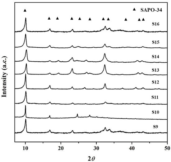 XRD for the as-synthesized SAPO-34 particles (S9–S16) with varied P2O5 concentration (y), synthesis time, and variation in phosphoric acid addition time.