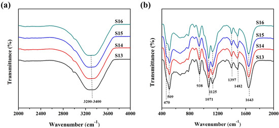 FTIR of the gels prepared with different phosphoric acid addition time (S13–S16): (a) 2000–4000 cm−1, and (b) 400–2000 cm−1.