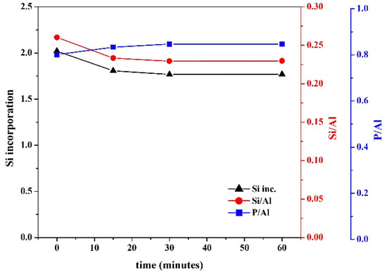 Energy disperse X-ray spectroscopy (EDX) by using a JSM-7000F field emission scanning electron microscope (JEOL Ltd., Tokyo, Japan) was used to analyze the composition. Each sample was tested at 5 points to gain reliable data, and the average was used for the calculation of molar Si/Al and P/Al ratios, and Si incorporation. The Si incorporation was calculated using the following equation: