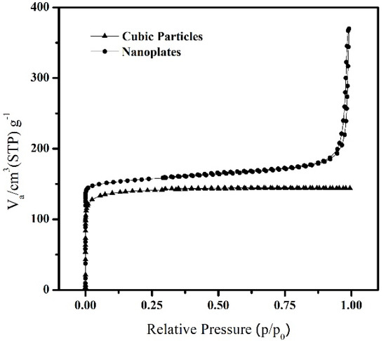 The BET adsorption isotherms for N2 adsorption on cubic (S13) and nanoplates (S15) SAPO-34 particles are shown in Figure 8. It can be observed that both the cubic and nanoplate SAPO-34 particles show type I adsorption behavior at lower p/po values. The isotherm at higher p/po in the S15 sample shows a sharp increase in adsorption due to condensation in the macroposity generated by the stacking of SAPO-34 sheets. The surface area characteristics for the cubic and plate-like particles are presented in Table 3, where it can be clearly seen that the nanoplates exhibit higher BET surface area and total pore volume as compared with the cubic particles.